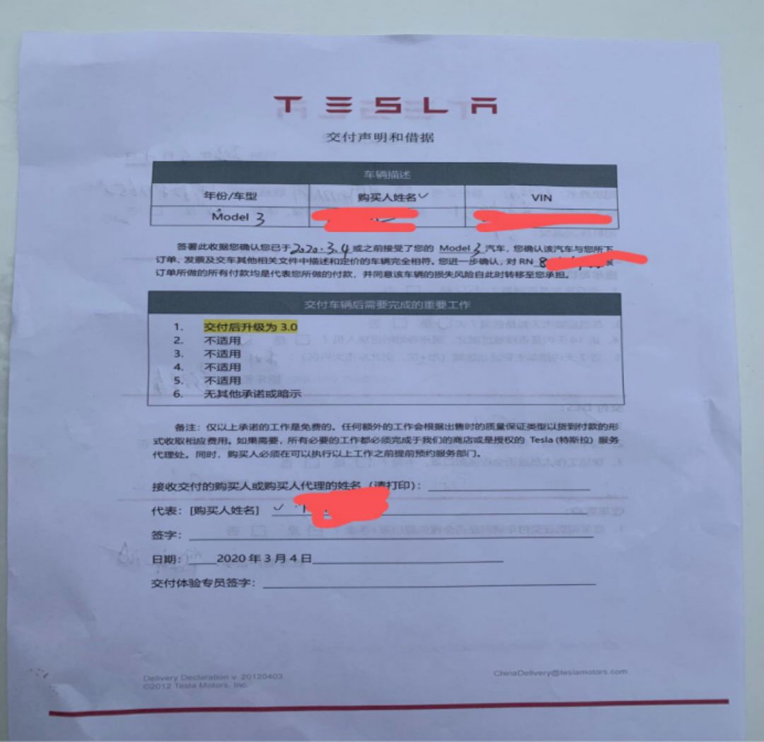 最新的迹象表明,特斯拉在此事上已经吸取教训。3月4日,有车主提供的“交付声明和借据”中,特斯拉已经注明“交付后升级为3.0”。