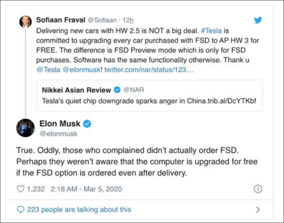 3月5日,马斯克也在推特上发文对HW 2.5和HW 3.0的争议进行表态。马斯克称,“那些投诉的车主实际上并没有订购FSD。他们可能并不清楚,如果在交付后又订购了FSD,那么相应的计算机硬件是可以免费升级的。”马斯克说,特斯拉目前正计划在本月晚些时候发布FSD的更多功能。