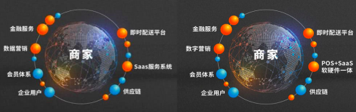 收购客如云后,阿里本地生活平台修改了对商家服务的描述,将“SaaS服务系统”改成“POS+SaaS软硬件一体”,强调了POS终端硬件能力。