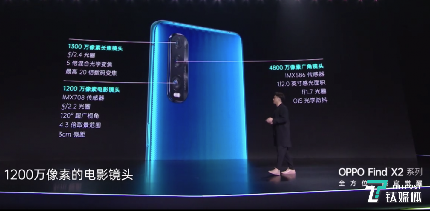 此次,Find X2 Pro 配备超强三摄组合,4800万广角镜头+4800万超广角镜头+1300万潜望式长焦镜头,三颗摄像头接力实现10 倍混合光学变焦。