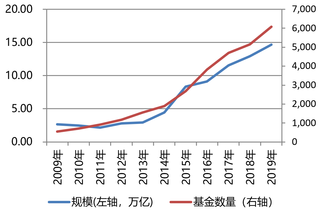 2019年,中国的公募基金总规模14.66万亿,基金数量6084只。而这两个数字,在十年之前,只有2.67亿和557只。