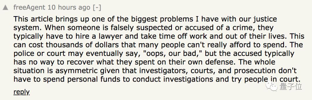 也有人评论认为,这是美国司法系统的bug,当一个人被误认为是犯罪嫌疑人的时候,必须自掏腰包请律师证明自己清白,但弄错的警察却不用自己个人掏钱请律师起诉,这是不对等的。