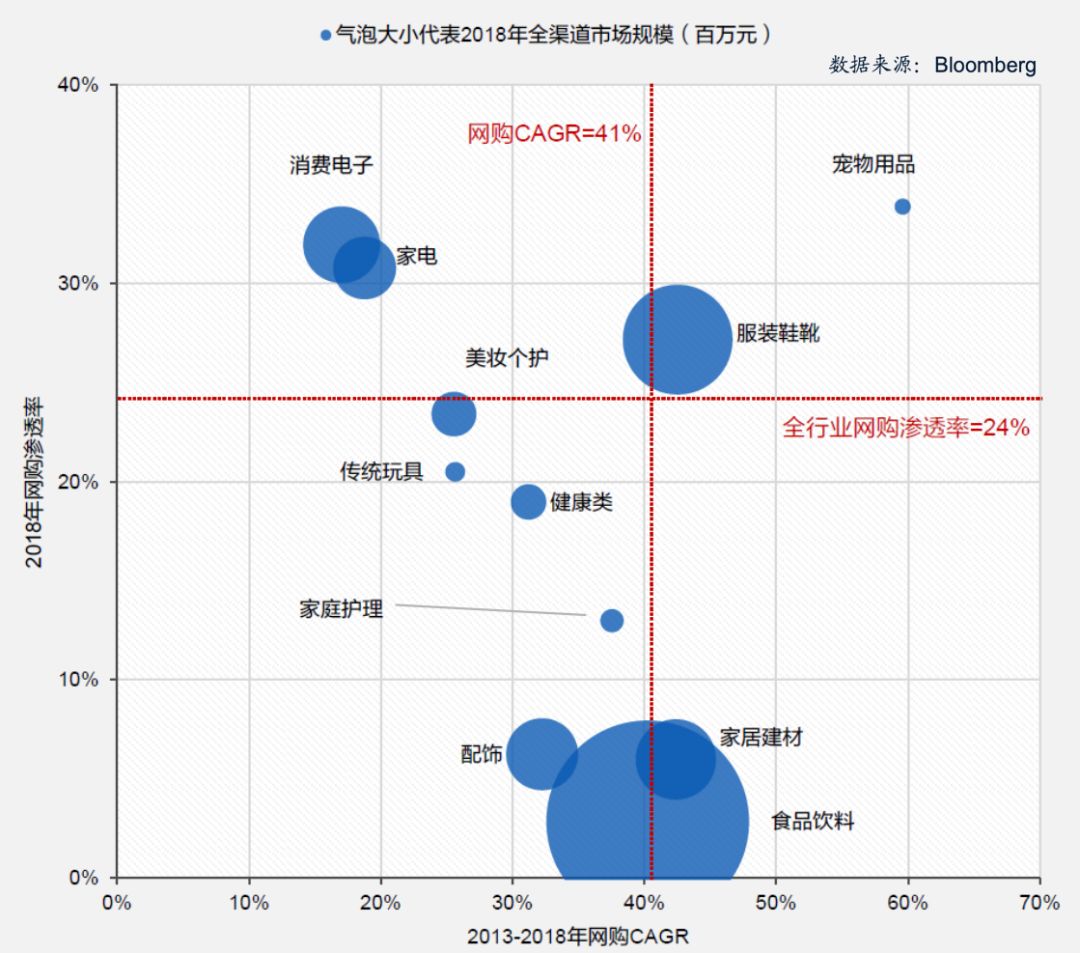 从网购渗透率来看,2018年服装鞋靴、消费电子、家电、宠物食品等品类线上渗透率均超过全行业平均水平,其中市场规模较大的品类如服装鞋靴、家用电器、消费电子网购渗透率分别达到27%、31%、32%。