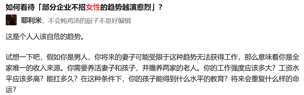 在男女平等的长征中,性别从来都不是双方互相攻击的手段。DT君很同意知乎网友@耶利米的说法:在这个部分企业不招女性趋势愈演愈烈的时代,人人都该自危。