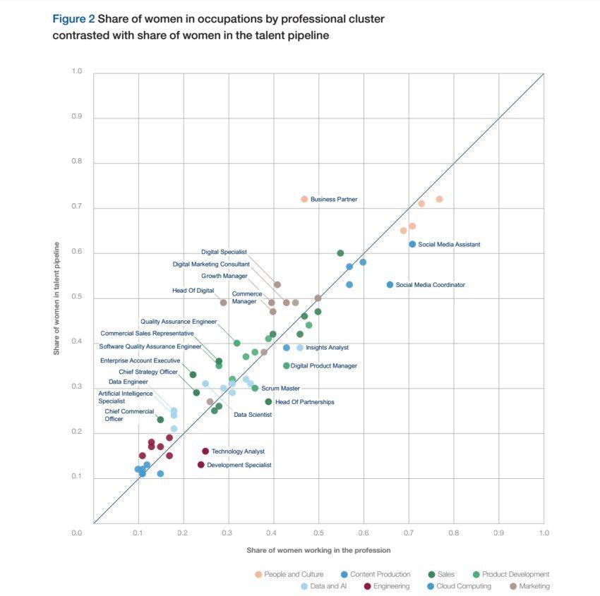 在进一步统计女性人才池(女性在该领域的人才数量占比)和进入该领域工作的女性员工数量占比之后,大家会发现,在云计算、工程、数据和AI领域的大多子领域,拥有相关技能的女性人才占比都要远远高于进入该行业工作的女性占比。