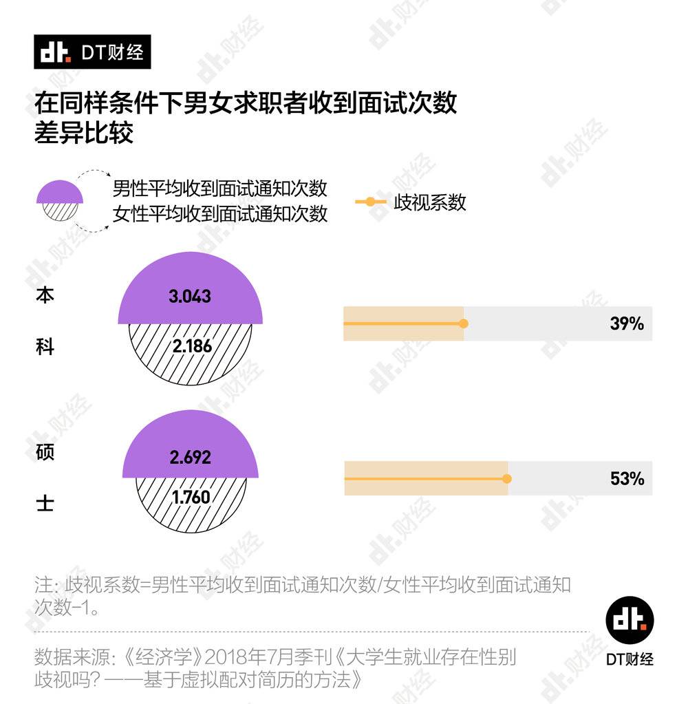 2018年《经济学》刊登的一项调查显示,在除了性别、身高,所有简历内容完全相同的情况下,学历为本科的女性求职者,平均收到面试通知的次数比男性要低39%;当学历水平上升至硕士后,男女平均收到面试通知次数的差距扩大至53%。