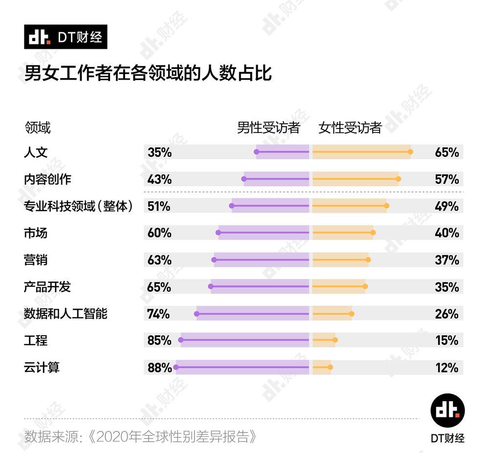 在《2020年全球性别差距报告》中,世界经济论坛定义了前沿领域(未来难以被人工智能取代的工作)的工作范围。在这些行业中,只有人文和内容生产领域女性的员工占比高于男性,而在云计算、工程、数据、人工智能领域,女性从业者的占比都不足30%,在产品开发、营销和市场领域,女性的占比也明显低于男性。
