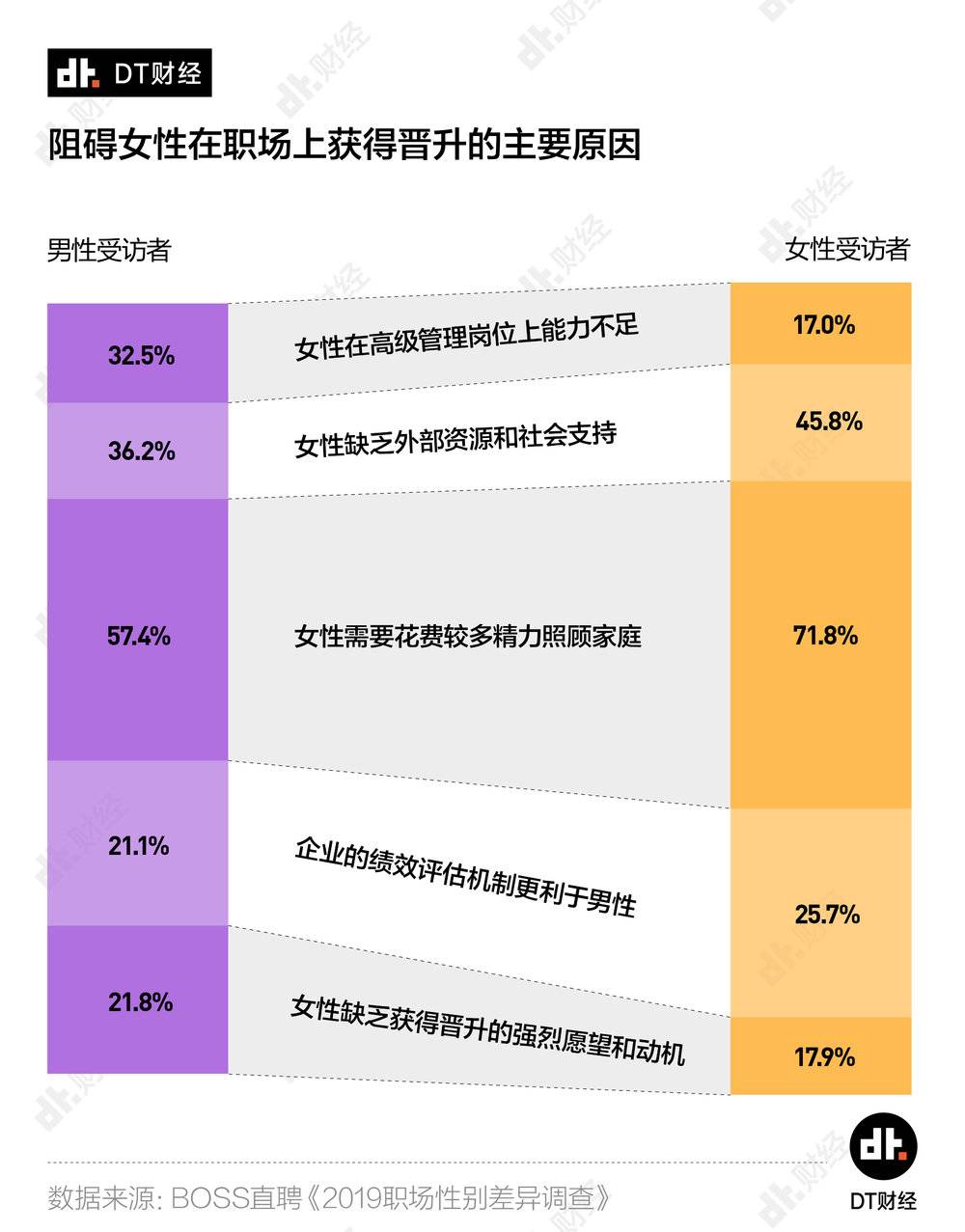 家庭会让女性的职场之路受阻,是大家的共识。我们在文首提到的璐璐便是个典型的例子。调研显示,有近6成男性和超过7成女性认为,“女性需要花更多的精力照顾家庭”是阻碍女性在职场上获得晋升最主要的原因。