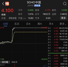 受该消息影响,3月10日,SOHO中国股价直线拉升,收于4.1港元/股,涨幅达37.58%。