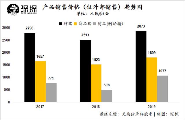 单价也透露出相同的现象,公司主打的种猪产品,从2017年的2798元到2019年前三季度的2873元,增长并不明显;商品猪从2017年的1657元增长到2019年前三季度的1809元,商品幼猪从771元增长到1077元,相比之下涨价幅度更大。