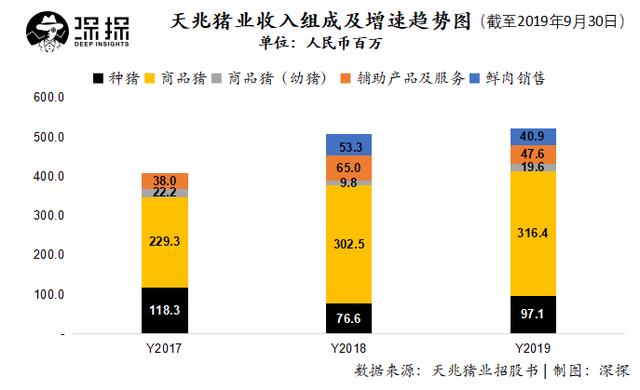 与此相反的是,2017年-2019年期间,来自商品猪销售的营业收入分别为2.29亿元 、3.02亿元、3.16 亿元,占营业收入的比率分别为47.0% 、59.7%、 60.7%。