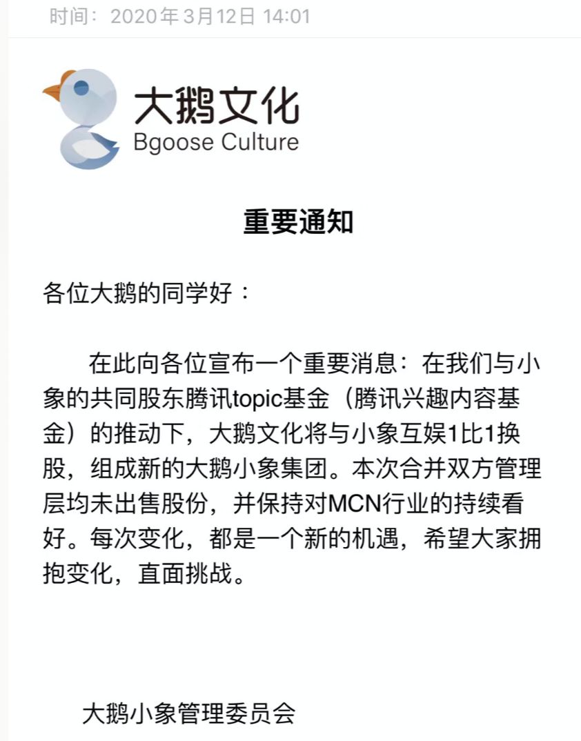 据《今日网红》报道,合并从2019年中旬已经启动,最初方案是由小象互娱先行合并另外一家游戏MCN机构,再将大鹅文化纳入麾下。
