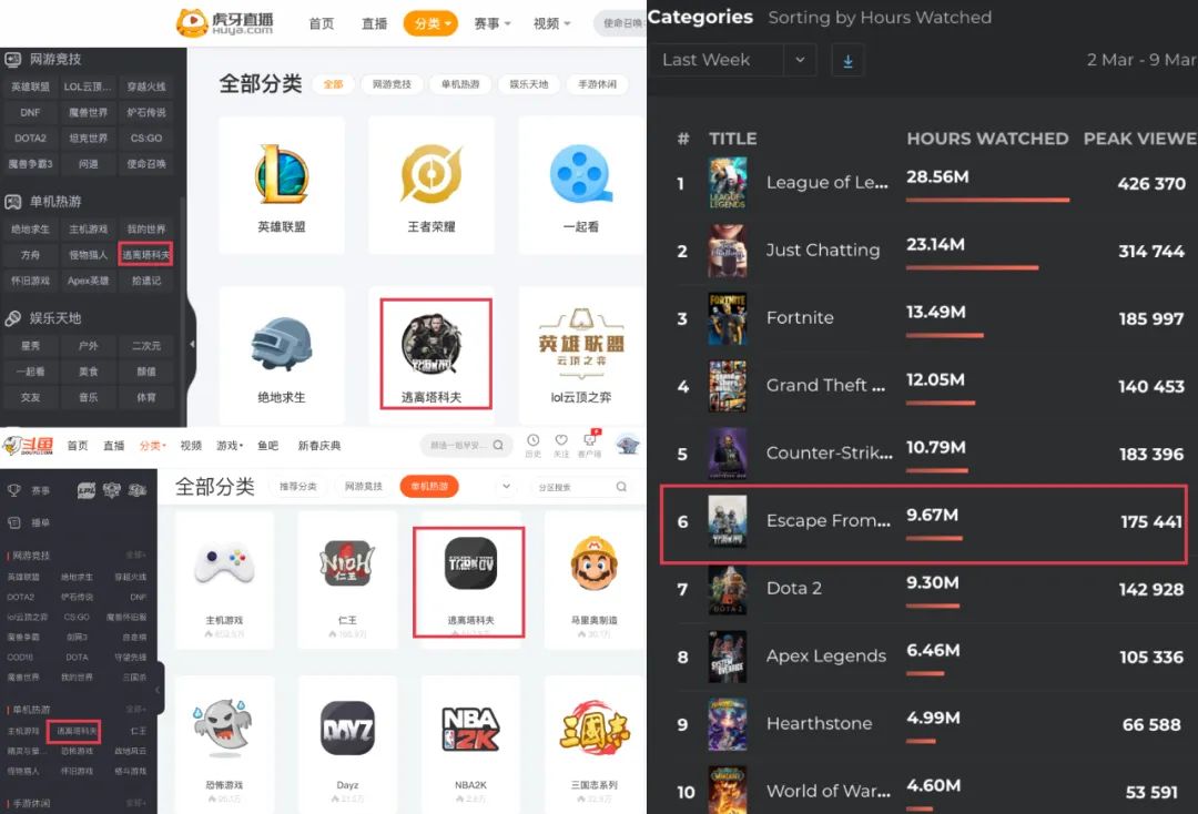 值得提出的是,在虎牙、斗鱼、Twitch等国内外游戏直播平台,《逃离塔科夫》有着超高热度,表明了这款硬核+理财的FPS游戏,有着一定的直播娱乐性和观赏性。