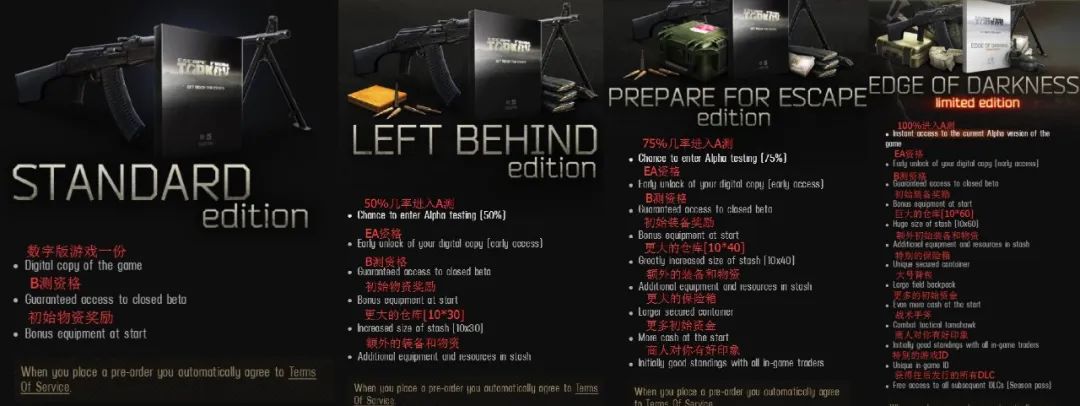 与《守望先锋》的售卖方式相同,《逃离塔科夫》提供了白边标准版(约310人民币)、生还者版(约520人民币)、黑暗边缘版(约980人民币)等多个游戏版本。