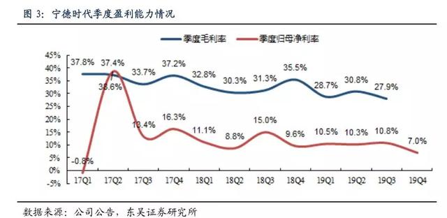 受此影响,宁德时代毛利率持续下滑。2019年三季报显示,公司第三季度毛利率为27.93%,创下公司近五年以来毛利率新低,也成为公司2019年下半年盈利水平下降的主要原因。