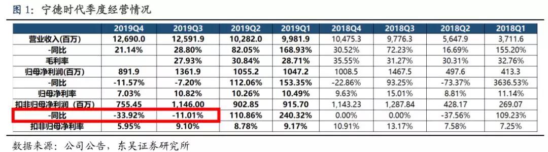 日前,创业板一哥宁德时代公布了公司2019年业绩快报。数据显示,与公司猛烈上涨的股价不同,宁德时代扣非净利润在去年第四季度下滑33.9%,这也是继去年第三季度以来,公司单季度利润再次下滑。