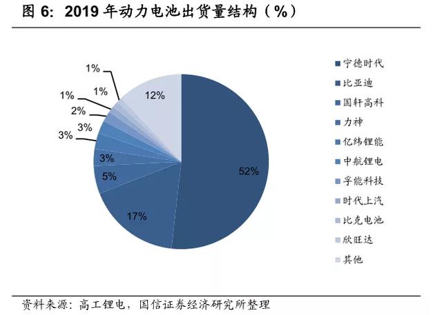 据高工锂电数据显示,2019年国内动力电池装机量62.4GWh,同比增长9.5%。其中,宁德时代装机量达到32.3GWh,对应国内市占率为51.79%,再创历史新高。