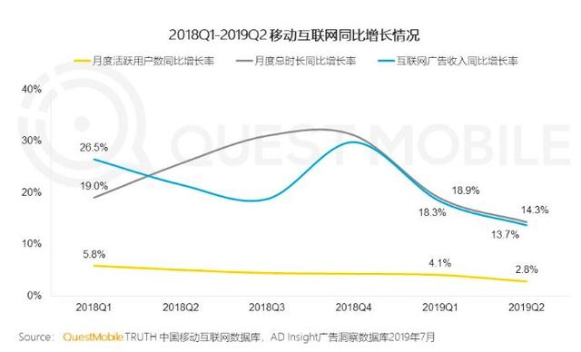 据QuestMobile数据,2019年上半年,移动互联网流量和广告收入呈现“双降”趋势,下半年的移动互联网用户规模增速已降到了“1%”时代。
