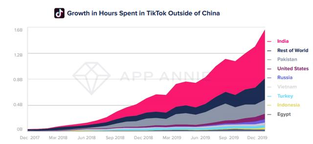 TikTok在海外市场的用户时长增长 图源:APP ANNIE