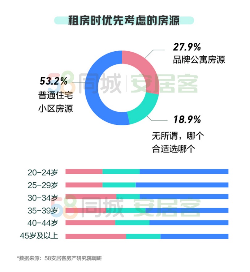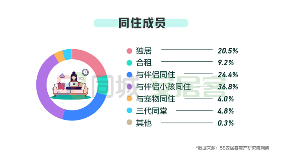 据58同城、安居客《2020一季度租房趋势报告》调研数据显示,20.5%的租客独居,61.2%的租客与伴侣或一家三口租住,9.2%的租客与人合租,还有4.0%的租客与宠物同处一室。50.0%的租客住在普通住宅小区,30.0%的租客选择租住品牌公寓房源,其余则租住在城中村之类的社区中。