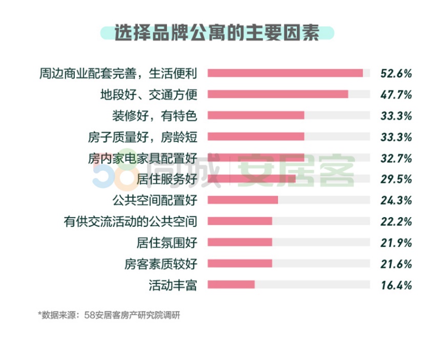 58安居客房产研究院调研数据发现,面对租房市场上的个人房源、品牌公寓,53.2%的租客更倾向选择普通住宅小区房源,优先考虑品牌公寓房源的占比为27.9%。不过,从年龄分布上看,30岁以上租客选择品牌公寓的占比31.2%,可见“90前”对品牌公寓接受度更高。“90前”收入水平相对较稳定,部分也已成家立业,从居住的舒适度、便捷度、稳定性上考虑,更偏好配套完善的品牌公寓。据58安居客房产研究院数据显示,52.6%的受访者认为品牌公寓周边商业配套完善、生活便利,47.7%认为地段好、交通方便,这些“卖点”吸引了不少租客。