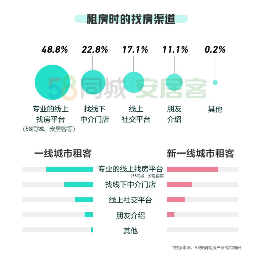 在找房渠道方面,48.8%的租客会通过58同城、安居客等专业线上找房平台寻找合适房源,有22.8%的租客会通过线下中介门店找房。新一线城市中通过线上平台找房的租客占比50.7%,占比高于一线城市。通过安居客等优质的线上找房平台已成为租客找房的“习惯性”行为。