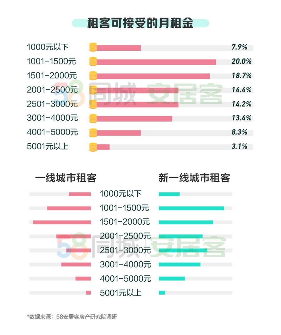 58同城、安居客《2020一季度租房趋势报告》数据显示,在可接受的月租金方面,38.7%的租客的租金价格区间为1000-2000元/月。其中,一线城市月租金在1501-2000元/月价格段的占比最高,为20.7%;新一线城市中占比最高的价格段为1001-1500元/月。