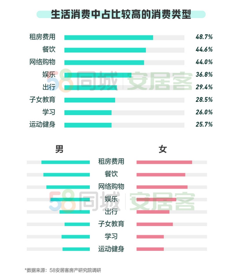 据58同城、安居客调研数据反映, 48.7%受访者表示租房消费占比较高,排在各种生活消费之首。其次是餐饮和网络购物消费,分别占比44.6%和44.0%。与男性受访者相比,更多女性租客表示租房费用占生活消费的比重较高,同时,在网络购物支出上花销较高的女性租客也占比更多。