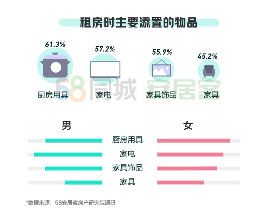 58同城、安居客《2020一季度租房趋势报告》指出,“拎包入住”是租客们的美好理想,而多数时间租客需自行添置生活所需物品。58安居客房产研究院调查数据显示,61.3%的租客添置了厨房用具,57.2%和55.9%的租客分别添置了家电和家具饰品。其中,70.3%的男性租客购买了家用电器,而女性租客添置物品最高类别是厨房用具,占比为61.3%。租客在物品的添置上主要以满足吃饭、储存食品、制冷制热等生活刚需,其次是将房间布置得更舒适美观。