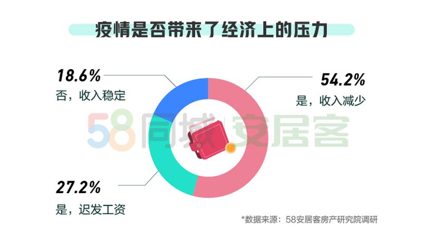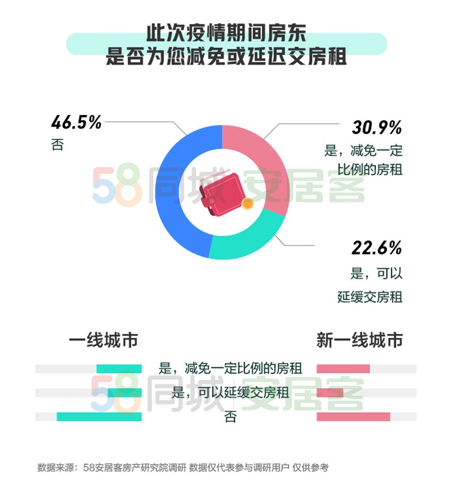 发布《2020一季度租房趋势报告》正值新冠肺炎疫情防控期间,据58安居客房产研究院数据统计,81.4%的受访者表示疫情带来了经济压力,54.2%的人收入减少,27.2%的人迟发工资。不过,这一期间涌现除了许多“中国好房东”,53.5%的受访者表示自己的房东给予一定的“租房优惠”,其中,30.9%的受访者表示房东减免了一定比例的房租,22.6%的被调研人群表示可延缓交租。