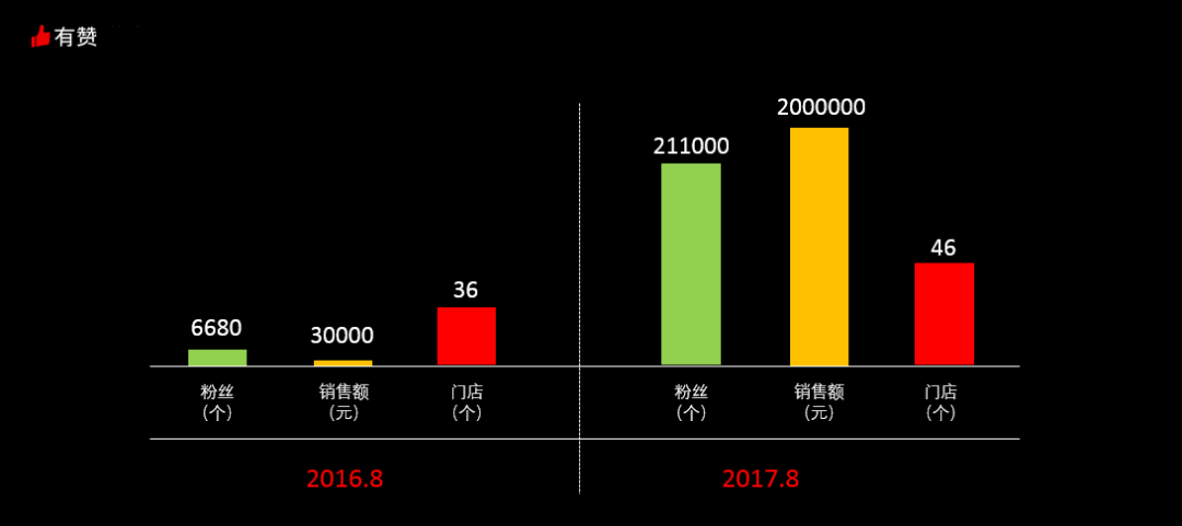 数据,能够给我们提供最好的证据和最强有力的说服力。我们在这里展示一下果琳很早以前的数据,粉丝、销售额、门店数量的指标对比。
