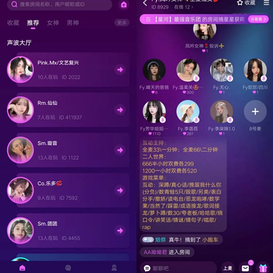 沿袭直播的商业路径,网易云音乐又在2019年11月推出音频直播App “声波”,主打聊天室连麦玩法,每个房间设1个房主和8个麦位,用户可抢麦或打赏连麦玩家。