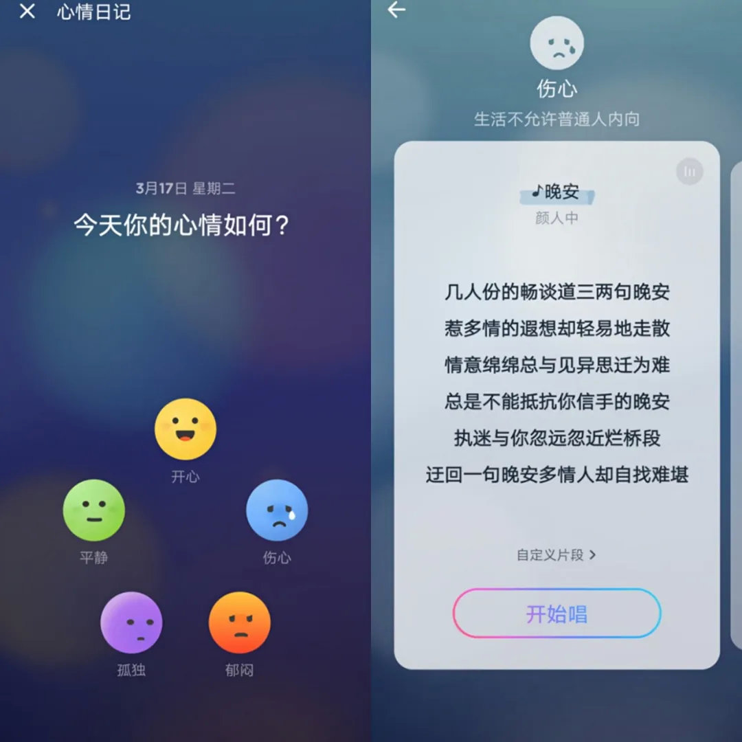 另外,相比唱吧、全民K歌,音街也推出了新的玩法“心情日记”,用户在“点歌台”内可选择“开心”“平静”等心情,由后台自动匹配相应歌曲供用户演唱。这种对个人情绪的关注,也与Z时代用户更注重自身好恶的特点相匹配。