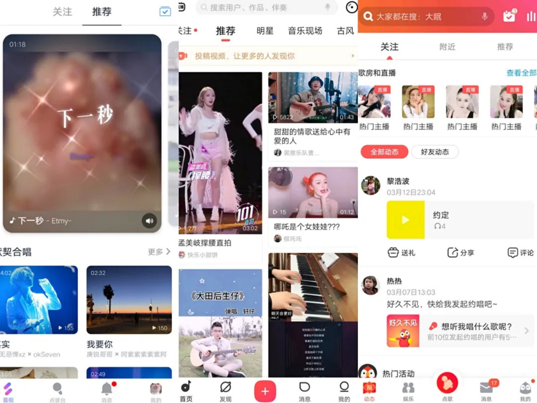 三款在线K歌App对比(左为音街,中为唱吧,右为全民K歌)