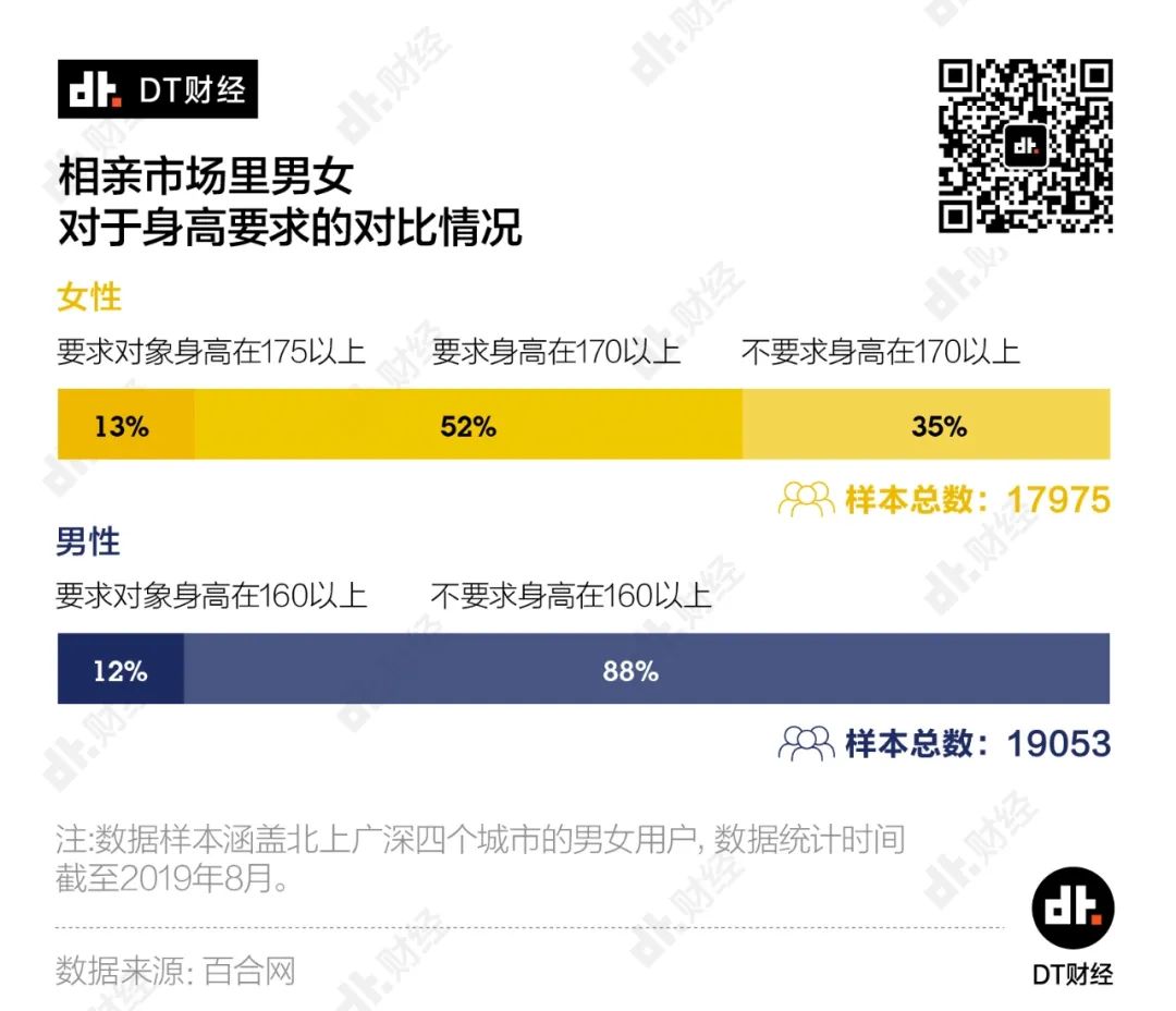 而在总样本17975名女性用户中,有超过一半以上的用户明确要求另一半身高要在170以上。而明确要求身高在175以上的女性,则占到总数的六分之一。对应现实的情况就是,我们经常能够听到身高不足170公分的男生,在相亲市场连“初筛”都过不了。