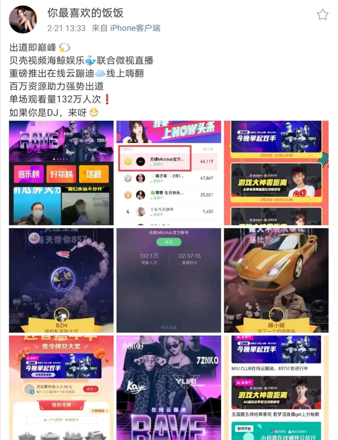这场“云蹦迪”的发起者,是MCN服务品牌贝壳视频旗下的直播公会海鲸娱乐。2月13日,他们推出了第一场云蹦迪的直播,并在很快达到小高峰。
