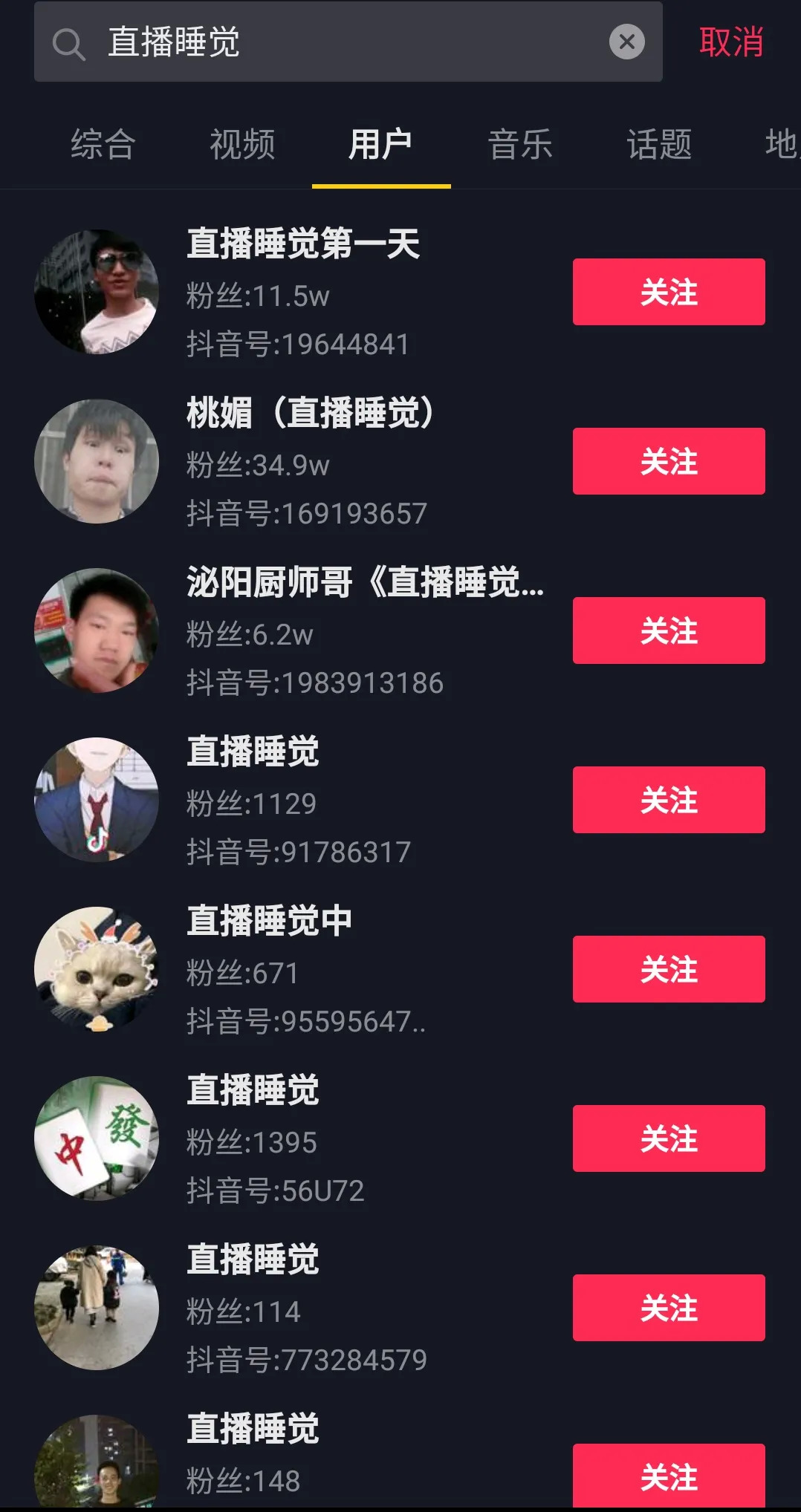 抖音App“直播睡觉”的搜索界面,图源抖音