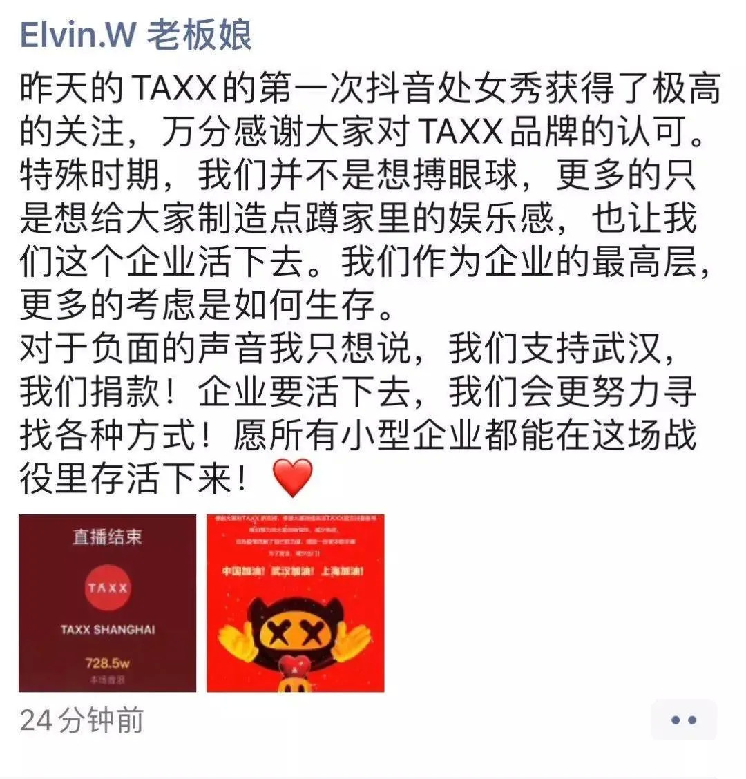 TAXX酒吧的管理层就在朋友圈写道,“特殊时期,我们并不是想搏眼球,更多的只是想给大家制造点蹲家里的娱乐感,也让我们这家企业活下去。我们作为企业的最高层,更多的考虑是如何生存。”