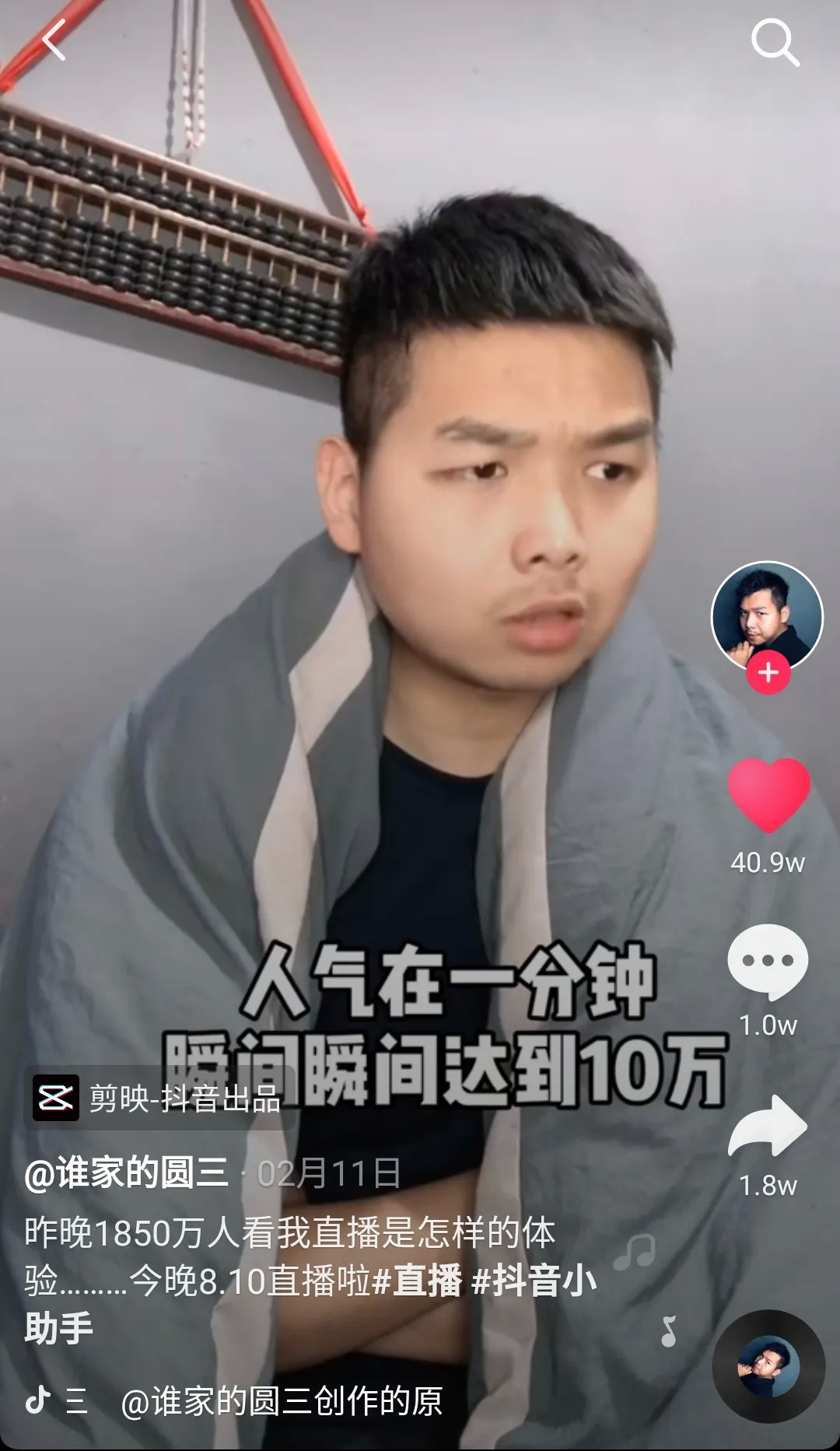 让圆三出手如此阔绰的原因,是他在抖音上发起的三场“睡觉直播”。2月9日那天,圆三突发奇想,想要拍下自己睡觉的视频来看看自己是否打呼,直播开启后,他意外火了。