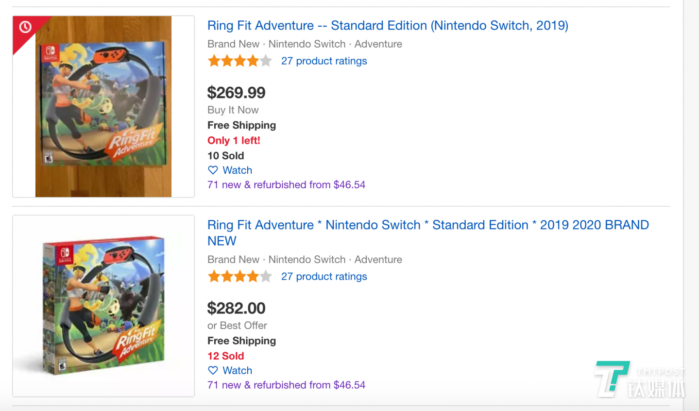 3月17日 ,任天堂 Switch Online 服务经历了九个小时的网络中断,其于去年发布的“理财产品”《健身环大冒险》在国外也已告罄。线上交易平台eBay上,这款原价$79.99的二手价格已上升至$130以上,钛媒体查询后发现$200以上的价格也不少见。