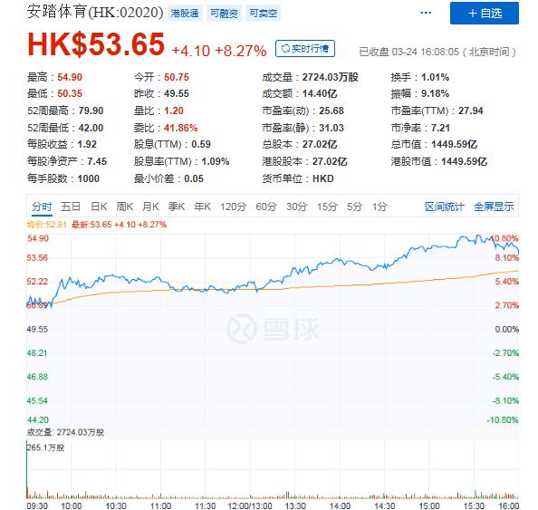 3月24日,安踏体育公布了其2019年全年财务报告。从财报来看,报告期内,财务数据显示,安踏体育营收和净利已经连续6年保持双位数增长,净利更是连续3年保持30%以上增长。受财报影响,截至24日收盘,安踏股价涨超8%,报收53.65港元,最新市值1449.5亿港元。