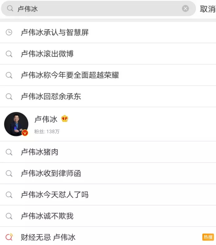 甚至,在微博搜索“卢伟冰”,延伸出的词条多数是“卢伟冰撕荣耀”、“卢伟冰回怼余承东”、“卢伟冰今天怼人了吗”这样的结果。