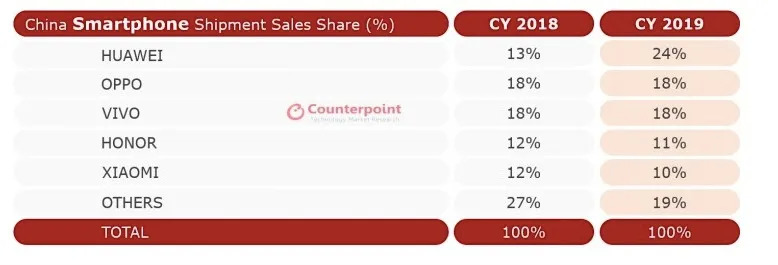 2018、2019年中国智能手机出货量市场份额,图源Counterpoint