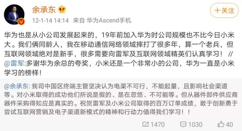 2012年,余承东曾发微博公开表示,“华为也是从小公司发展起来的,19年前加入华为时,公司规模也不比今天的小米大。我跟雷军是同龄人,我在移动通信网络领域摔打了很多年,算一个老兵,但在互联网领域绝对是新手,很多需要向雷总和互联网领域的精英们认真学习。”