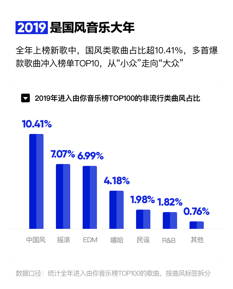 在最新公布的《2019年华语数字音乐年度报告》中,说唱类音乐和摇滚乐、中国风、民谣歌曲成为报告中唯四列出相关榜单的音乐类型,而在 2019年进入由你音乐榜TOP100的非流行类曲风中说唱类占比为4.18%,位列第四位。