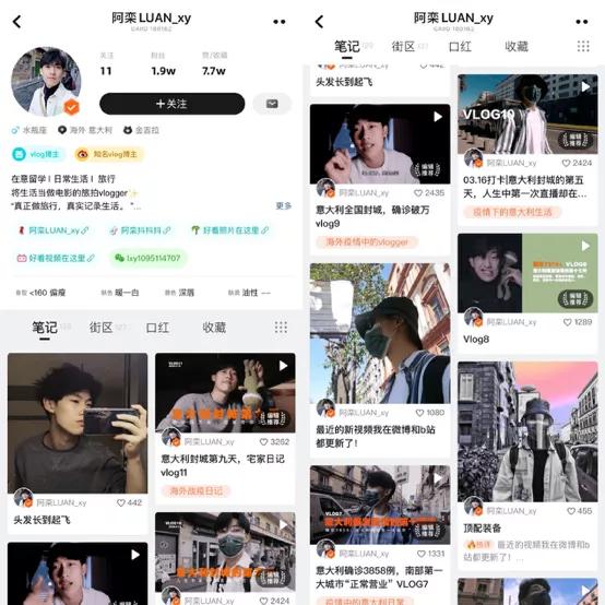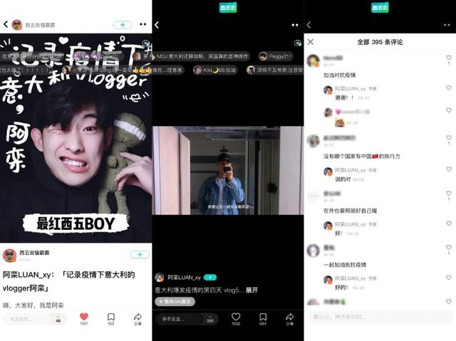 其次是平台的选择,这点很重要。阿栾最早在美妆测评社区西五街App分享一些意大利生活的点滴,受到了一些关注,意大利疫情爆发后,阿栾萌生了制作疫情生活主题Vlogger的想法。阿栾以留学生的视角,围绕生活在意大利的华人生活状况发布了多条vlog视频,迅速引起了西五街网友的关注,很多西五街的用户都将阿栾的vlog当成了意大利疫情的窗口,通过他的视频了解海外疫情。