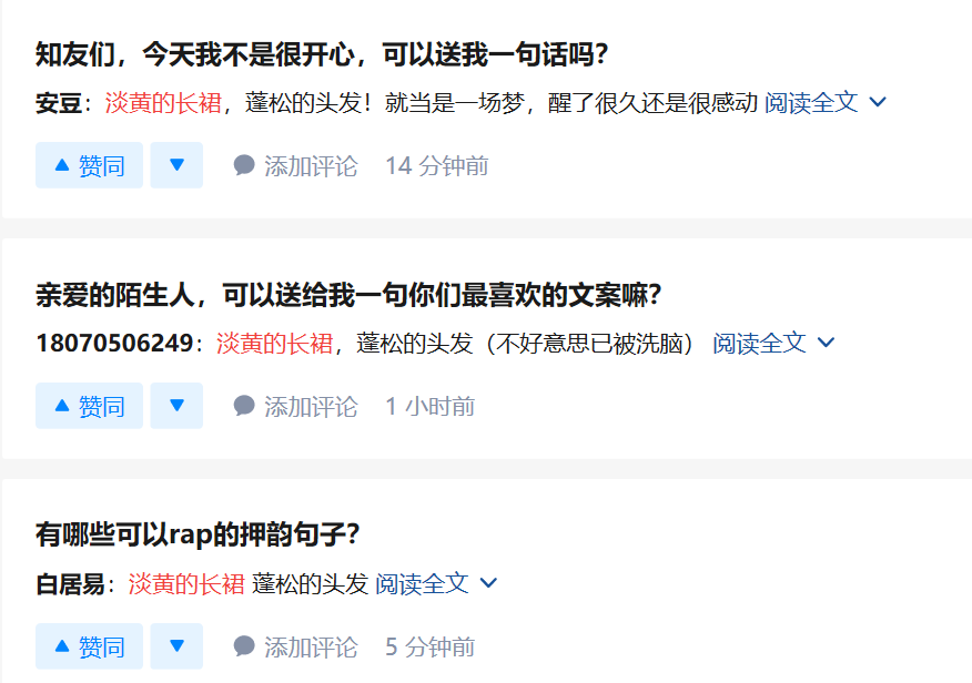 为什么“淡黄的长裙,蓬松的头发”一夜出圈?这倒也不难理解,从歌词上来看,这一作品以感情为主题而作,秦牛正威的歌词是以内心感慨为主,相对写意,外加似乎具有某种指向性的歌词,颇有“炒冷饭”之嫌,但就此引申反倒会引起部分粉丝群体的反感,在内容传播上并不占绝对优势,反倒是李熙凝的“淡黄的长裙,蓬松的头发”这一句有画面感且无负面含义的歌词,在传播上有着更包容的创作意向和空间。