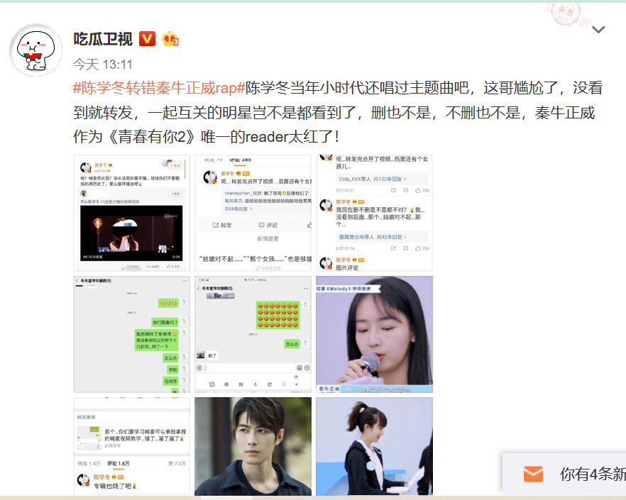 随后,陈学冬在评论中解释:“我没看到后面,那个...姑娘对不起...”最终,在征询工作人员的意见后,将这一微博删除,但是#陈学冬转错秦牛正威rap#这一话题还是登上了热搜第一名。读娱君也不得不感慨一句,陈学冬真的是搜自己名字的吃瓜老手,毕竟上一次陈玺达的瓜也是陈学冬带出圈的。