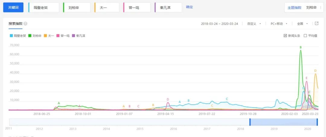 不仅云村的数据如此,毒眸对比了“一轮游”奇袭歌手的百度指数后也发现,几位歌手均在《歌手》迎来了两年以来的指数高峰,刘柏辛的飙升速度远高于其他几位奇袭歌手。