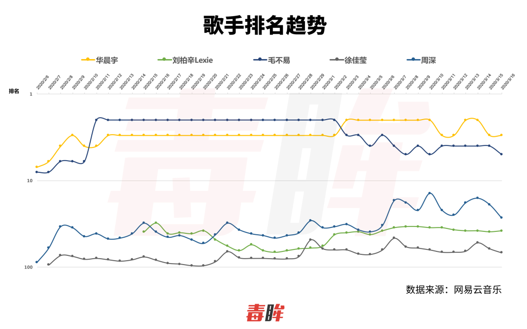 风格突出的周深和华晨宇始终名列前茅,但其他几位歌手几期下来风格的同质化,却造成了审美的乏力和社交媒体讨论度的疲软。毒眸统计了节目开播后,几位进入网易云音乐歌手榜TOP100的歌手的排名趋势,发现除了上文提及的各具风格的华晨宇、周深、刘柏辛、毛不易,目前的在线歌手中仅有徐佳莹入榜,且排名是五位歌手里最低的。